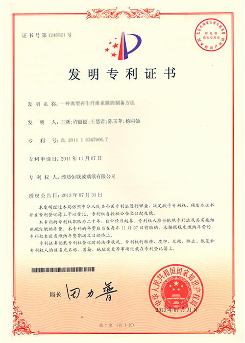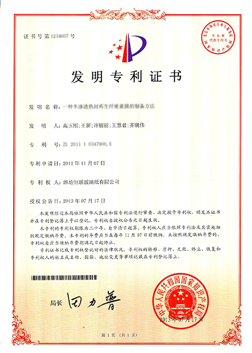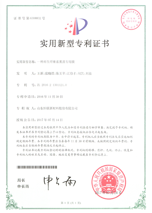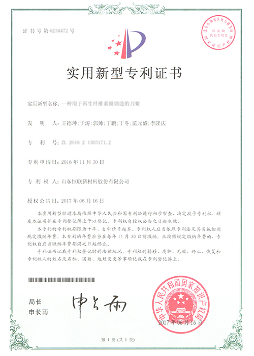 直線打孔再生纖維素膜——被列入“2012年山東省第一批技術(shù)創(chuàng)新項(xiàng)目計(jì)劃”(魯經(jīng)信技字[2012]109號(hào)),已通過山東省級(jí)科技成果鑒定。